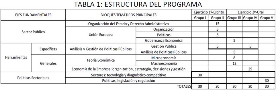 De este modo, se incluyen un amplio abanico de materias relacionadas con el derecho administrativo; la organización del Estado y la Unión Europea; la regulación de sectores y actividades como la industria, energía, telecomunicaciones, medio ambiente, comercio, ciencia y tecnología, entre otros; la situación actual, tecnología y caracterización de los diferentes procesos productivos y sectores industriales en España; teoría económica, fiscalidad y finanzas; políticas públicas, gestión pública y gestión empresarial, entre otras materias relevantes.